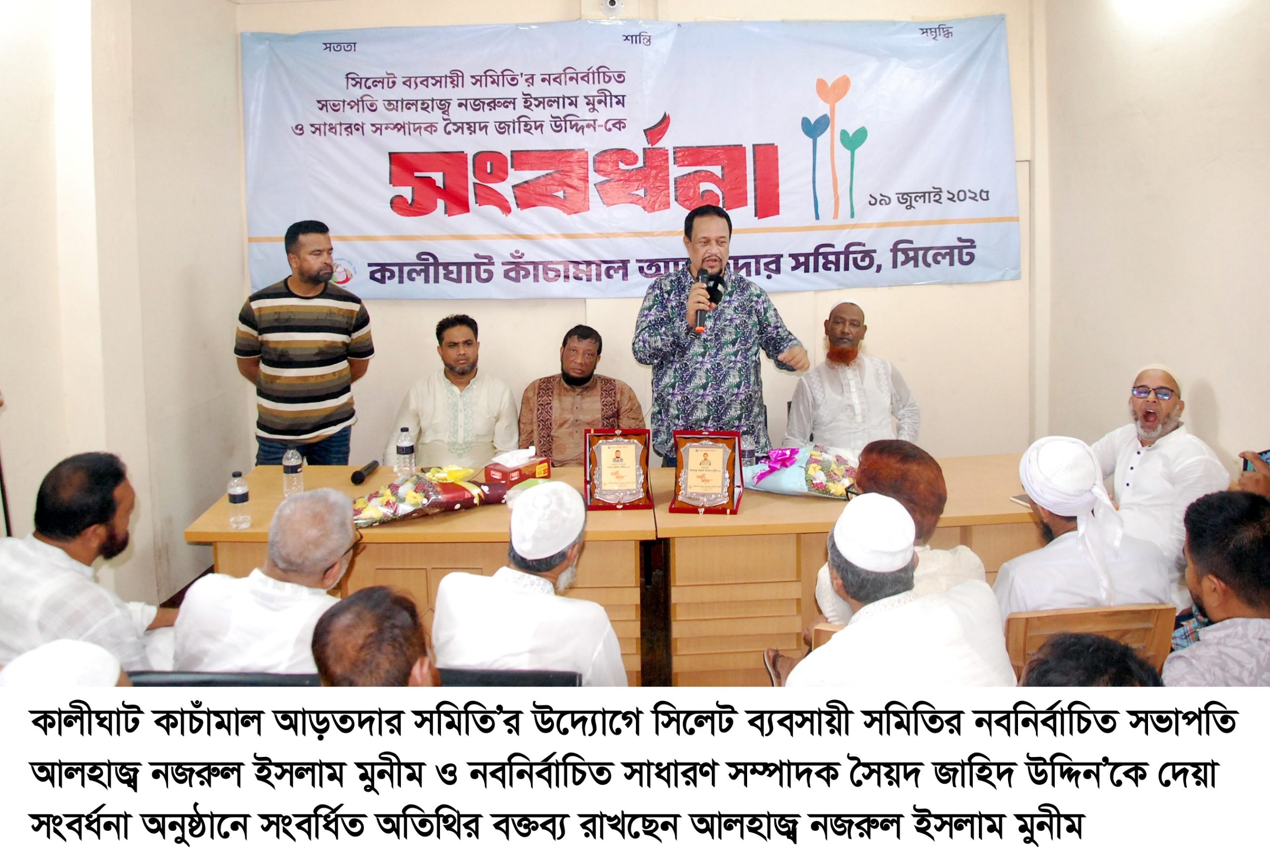 কালীঘাট কাচাঁমাল আড়তদার সমিতি সিলেটের উদ্যোগে সিলেট ব্যবসায়ী সমিতির নবনির্বাচিত সভাপতি আলহাজ¦ নজরুল ইসলাম মুনীম ও নবনির্বাচিত সাধারণ সম্পাদক সৈয়দ জাহিদ উদ্দিন’কে সংবর্ধনা প্রদান করা হয়েছে।