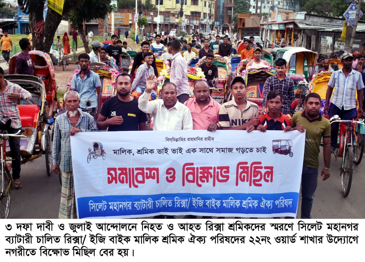 ৩ দফা দাবী ও জুলাই আন্দোলনে নিহত ও আহত রিক্সা শ্রমিকদের স্মরণে সিলেট মহানগর ব্যাটারী চালিত রিক্সা/ ইজি বাইক মালিক শ্রমিক ঐক্য পরিষদের ২২নং ওয়ার্ড শাখার উদ্যোগে নগরীতে এক বিক্ষোভ মিছিল ও সমাবেশ অনুষ্ঠিত হয়েছে।