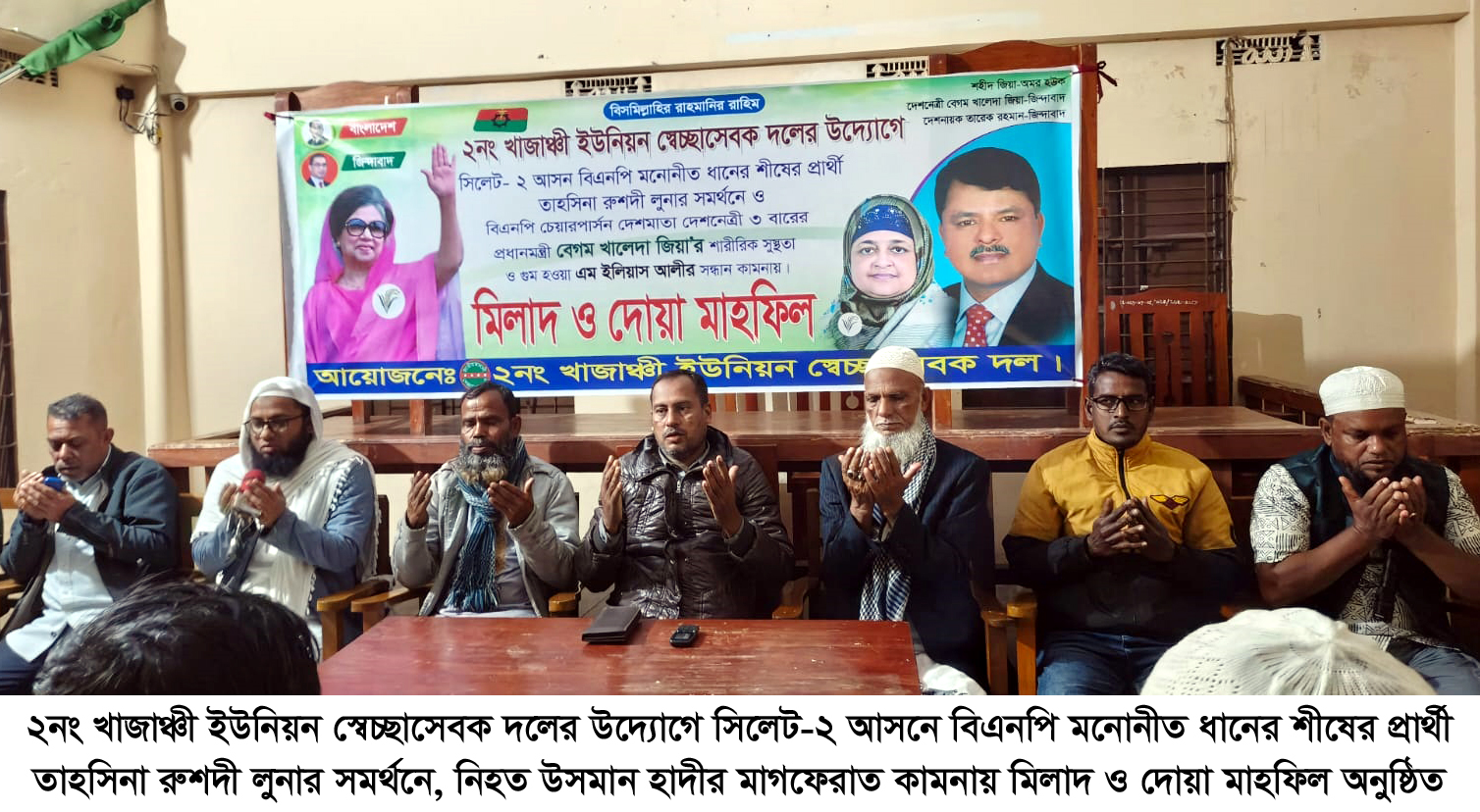 ২নং খাজাঞ্চী ইউনিয়ন স্বেচ্ছাসেবক দলের উদ্যোগে সিলেট-২ আসনে বিএনপি মনোনীত ধানের শীষের প্রার্থী তাহসিনা রুশদী লুনার সমর্থনে, নিহত উসমান হাদীর মাগফেরাত কামনায় এক মিলাদ ও দোয়া মাহফিল অনুষ্ঠিত হয়েছে। একই সঙ্গে বিএনপি চেয়ারপার্সন, দেশমাতা দেশনেত্রী ও তিনবারের সাবেক প্রধানমন্ত্রী বেগম খালেদা জিয়ার দ্রুত শারীরিক সুস্থতা এবং গুম হওয়া জাতীয় নেতা এম ইলিয়াস আলীর সন্ধান কামনায় বিশেষ দোয়া করা হয়। শনিবার (২০ ডিসেম্বর) রাতে খাজাঞ্চি ইউনিয়ন কমপ্লেক্স হলরুমে এই অনুষ্ঠানের আয়োজন করা হয়। এতে মোনাজাত পরিচালনা করেন খাজাঞ্চি স্টেশন জামে মসজিদের ইমাম ও খতিব মুফতি মাওলানা আব্দুর রহমান।