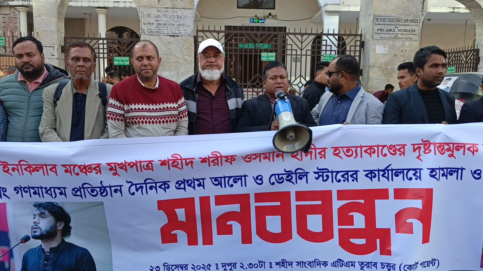 ইনকিলাব মঞ্চের মুখপাত্র শহীদ শরীফ ওসমান হাদীর হত্যাকাণ্ডের দৃষ্টান্তমূলক বিচারের দাবিতে এবং গণমাধ্যম প্রতিষ্ঠান দৈনিক প্রথম আলো ও ডেইলি স্টার কার্যালয়ে হামলা ও ভাঙচুরের প্রতিবাদে সিলেট অনলাইন প্রেসক্লাবের উদ্যোগে মানববন্ধন অনুষ্ঠিত হয়েছে।