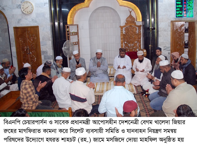 বুধবার (৩১ ডিসেম্বর) বাদ জোহর নগরীর কালীঘাটস্থ হযরত শাহচট (রহ.) জামে মসজিদে এ দোয়া মাহফিলের আয়োজন করা হয়। দোয়া মাহফিলের পূর্বে সিলেট ব্যবসায়ী সমিতির সভাপতি আলহাজ্ব নজরুল ইসলাম মুনিম বলেন, জাতির এই সংকটময় মুহূর্তে আপোসহীন দেশনেত্রী, গণতন্ত্রের মাতা বেগম খালেদা জিয়াকে হারিয়ে আমরা এতিম হয়ে গেলাম। তাঁর অভিভাবকসুলভ দিকনির্দেশনা আজ জাতির জন্য খুবই প্রয়োজন ছিল। সারাদেশের মানুষের চোখের জল আর আবেগই বলে দেয়, বেগম খালেদা জিয়া রাজনীতির গণ্ডি ছাড়িয়ে সাধারণ মানুষের হৃদয়ে জায়গা করে নিয়েছিলেন। তিনি বলেন, আমরা মহান আল্লাহর কাছে বেগম জিয়ার রুহের মাগফেরাত এবং জান্নাতুল ফেরদাউসের মেহমান বানানোর জন্য প্রার্থনা করছি। পুরো জাতিকে যেন আল্লাহ এই শোক সহ্য করার শক্তি দান করেন।